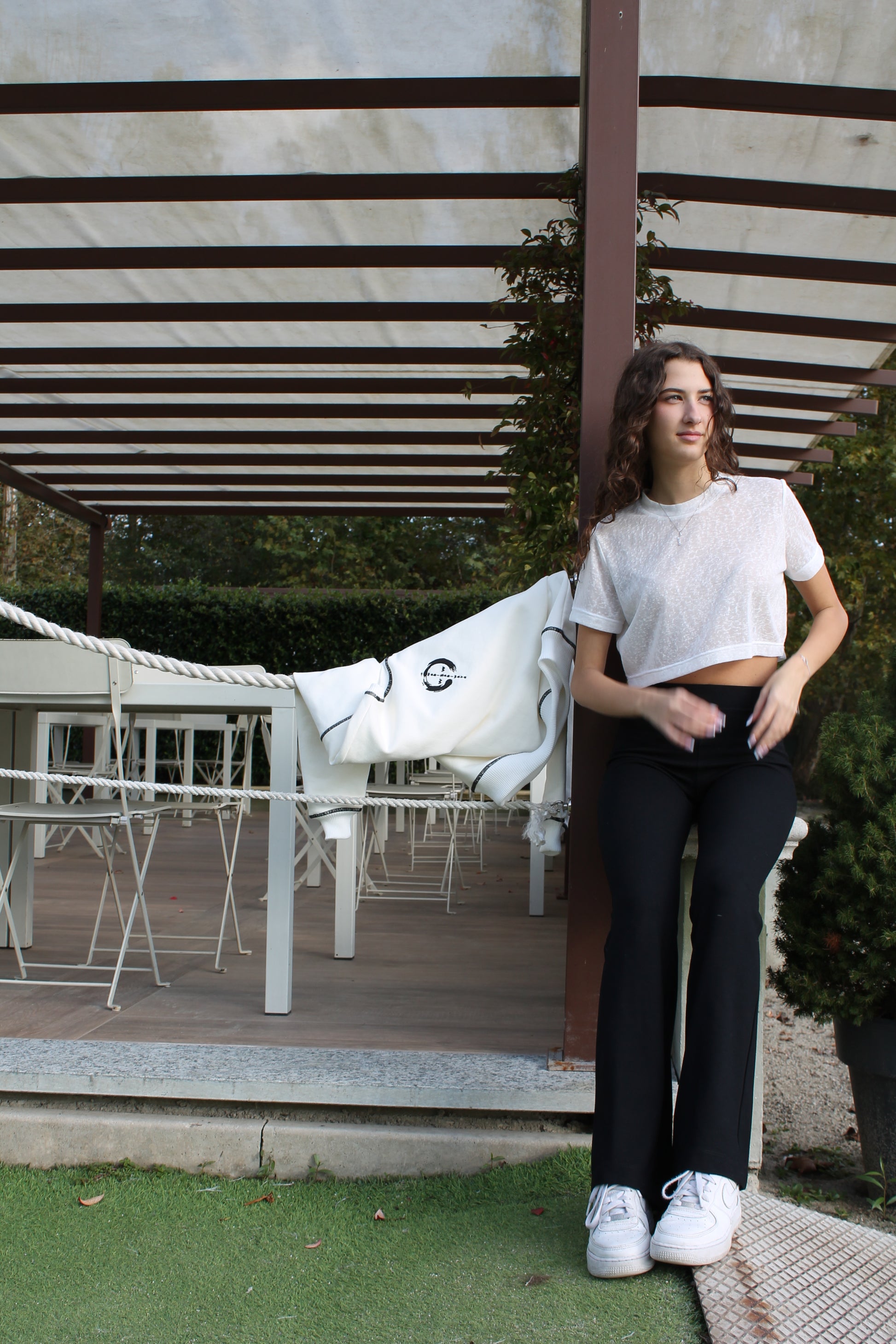 La t-shirt crop top è in jersey velato bianco, semitrasparente